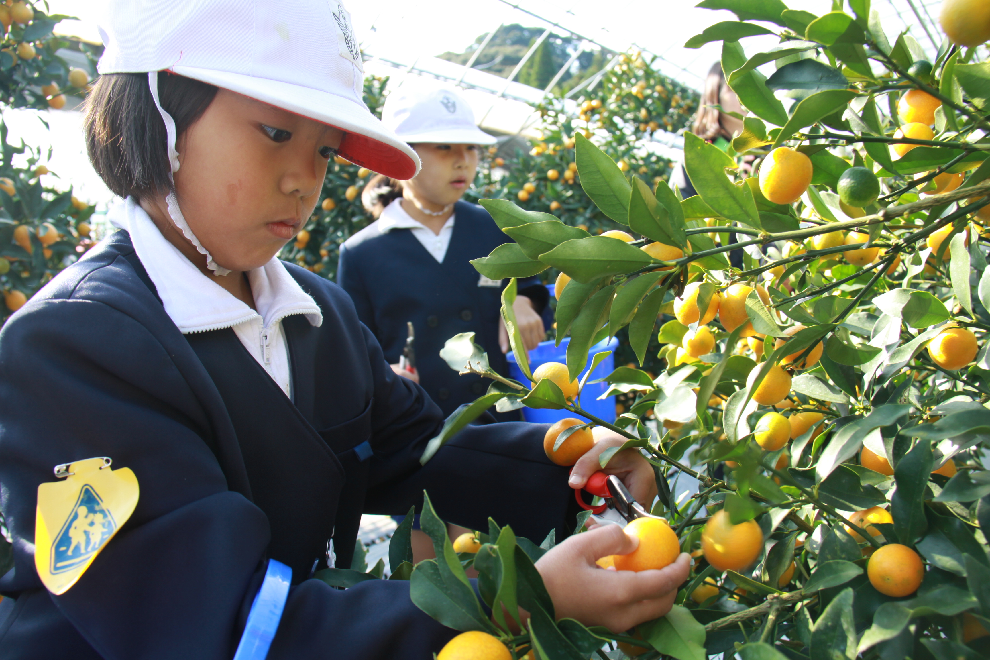 薩摩川内市特産「ハウスきんかん」の出荷が始まりました。同市入来町の㈲中之原製茶のキンカン園で11月25日、はさみ入れ式があり、生産者やJA、行政関係者ら約80人が参加しました。近くの大馬越小学校の全校児童12人も招待され、黄色く色づいたキンカンの収穫を楽しみました。