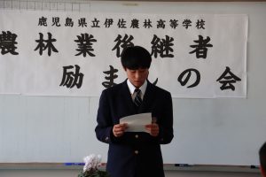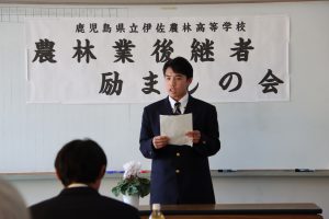 伊佐市農林業後継者育成推進協議会は2月2日、県立伊佐農林高校で励ましの会を開きました。同校では畜産関連会社に1人が就職し、1人がかごしま林業大学校に進学します。